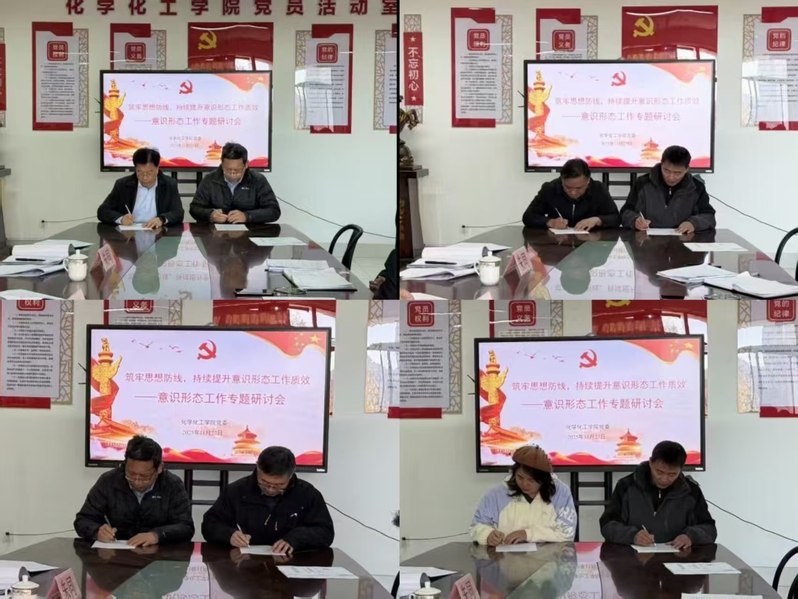 11月27日,化学化工学院在2号综合楼B2015室召开以“筑牢思想防线,持续提升意识形态工作质效”为主题的意识形态工作专题研讨会。校党委委员、党委宣传部部长张伟列席指导,宣传部意识形态科科长朱同、学院领导班子成员、党支部书记、辅导员及行政人员参会。会议由学院党委书记姜焕伟主持。