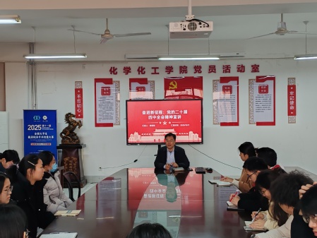 为深入学习宣传贯彻党的二十届四中全会精神,引导广大党员干部准确把握全会核心要义和实践要求,化学化工学院于2025年12月11日在B2015室举行党的二十届四中全会精神专题党课,学院党委副书记、院长韩银锋主讲,部分学生党员代表参加。